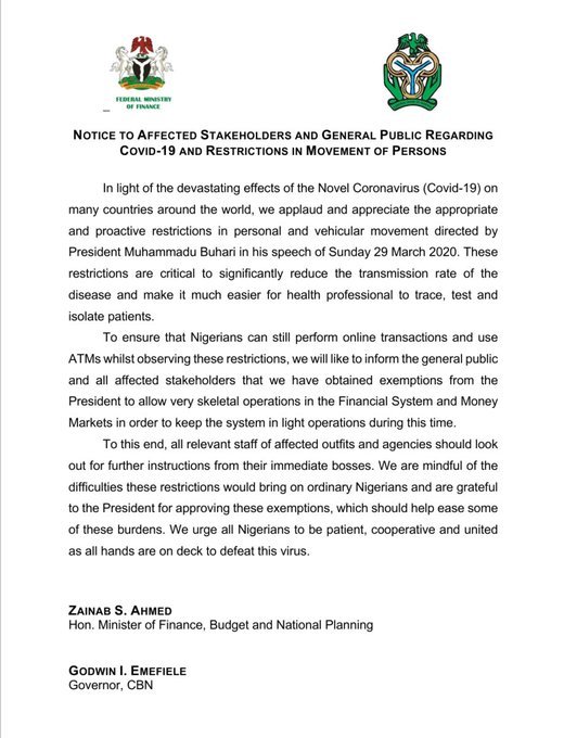 “To ensure that Nigerians can still perform online transactions and use of ATMs whilst observing these restrictions, we will like to inform the general public and all affected stakeholders that we have obtained exemptions from the President to allow very skeletal operations in the financial system and money markets in order to keep the system in light operations during the time.