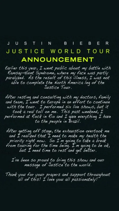 “As the result of this illness, I was not able to complete the North American leg of the Justice Tour,” he continued. “After resting and consulting with my doctors, family and team, I went to Europe in an effort to continue with the tour. I performed six live shows, but it took a real toll on me.”