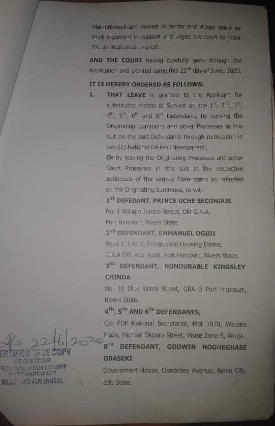 Joined in the suit are Prince Uche Secondus, the PDP, Independent National Electoral Commission, chairman of the party screening committee, Kingsley Chinda and other members of the committee.