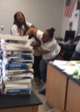 A teacher and a classroom aide duking it out in front of students at a Georgia middle school last week was caught on video.