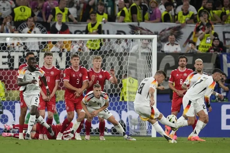 Jamal Musiala and Kai Havertz scored as Euro 2024 hosts Germany reached the quarter-finals by beating Denmark in a game that was interrupted by a spectacular storm.