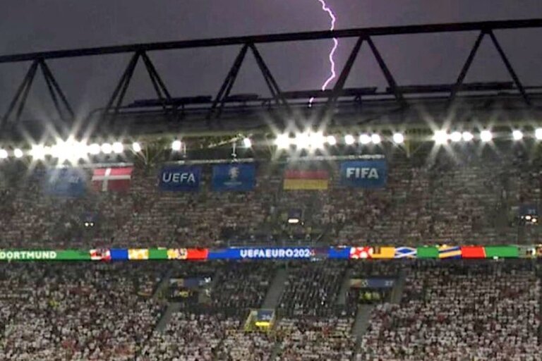 A storm has stopped Germany and Denmark’s Euro 2024 last-16 match in Dortmund, as thunder and lightning raged overhead in the first half and hailstones started to fall.