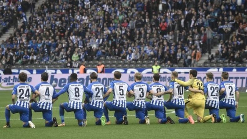 On Saturday, a tweet posted on the official Hertha Berlin account said the Bundesliga club stands for “a tolerant Berlin and an open-minded world, now and forevermore”, before adding the hashtag #takeaknee.