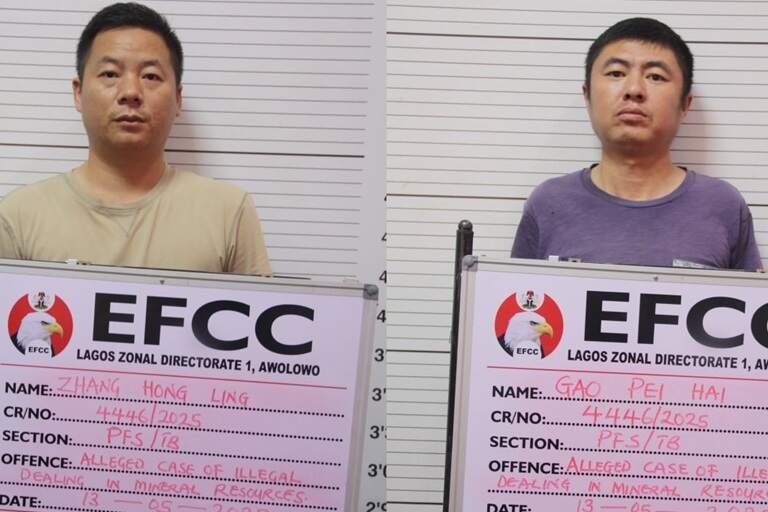 The Lagos Zonal Directorate 1 of the Economic and Financial Crimes Commission, EFCC, on Wednesday, June 4, 2025, arraigned two suspected Chinese illegal miners, Zhang Hong Lin and Zhao Pei Hai, before Justice Chukwujekwu Aneke of the Federal High Court in Ikoyi, Lagos.