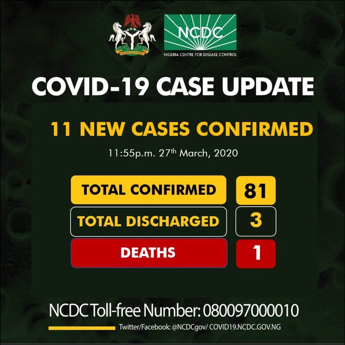 “As at 11:55pm 27th March, there are 81 confirmed cases of coronavirus reported in Nigeria. Three have been discharged with one death.