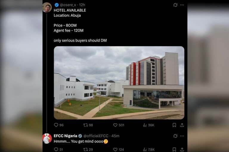 The Economic and Financial Crimes Commission (EFCC) has responded to a social media user who shared a picture of the commission’s headquarters in Abuja as a hotel up for sale.