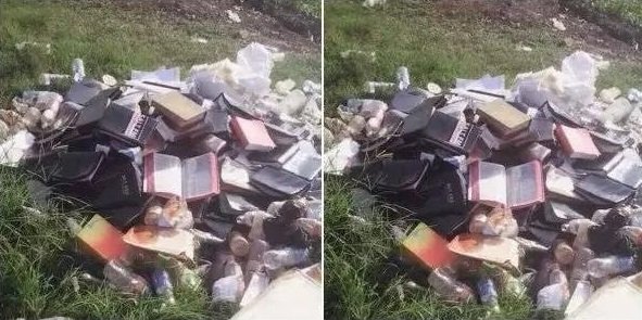Below is a picture of the Bibles before they were set on fire:
