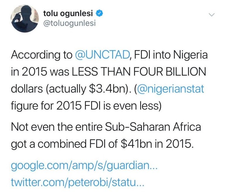 IndexMundi, quoting IMF figures also gave FDI for Nigeria as $5,562,874,000 in 2013, $4,655,849,000 in 2014(far lower than the $24billion quoted by Obi), $3,128,592,000 in 2015 and $4,434,648,000 in 2016. It fell to $3.4billion in 2017, according to World Bank data.