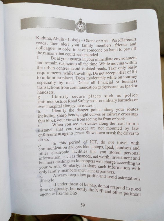 “When travelling in high risk roads such as Abuja-Kaduna, Abuja-Lokoja-Okene or Aba-Port Harcourt roads, alert your family members, friends and colleagues in order to have someone on-hand to pay off the ransom that could be demanded.”
