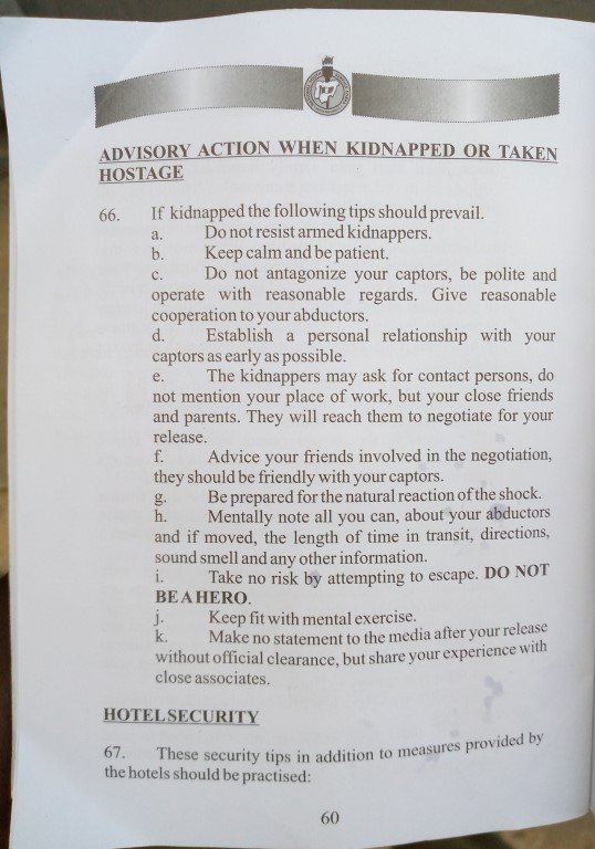 The handbook also warned that in the event of a kidnapping, if one is released, he/she must not speak to the media for any reason.