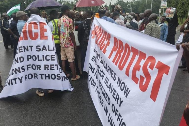 Some retired police officers protested at the National Assembly’s entrance gate in the rain in Abuja on Monday.