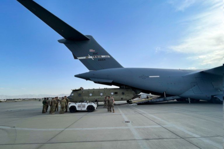 A CH-47 Chinook is loaded onto a U.S. Air Force C-17 Globemaster III at Hamid Karzai International Airport in Kabul, Afghanistan, August 28, 2021. The Chinook is one of the pieces of equipment returning to the U.S. as the military mission in Afghanistan comes to an end.