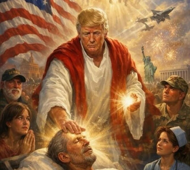 The image, shared on Truth Social, shows Trump robed and surrounded by radiant light, appearing to perform a healing. Figures resembling angels or soldiers hover nearby, while fighter jets streak across the sky and fireworks explode overhead. The Statue of Liberty looms in the background, blending religious imagery with American military symbolism.