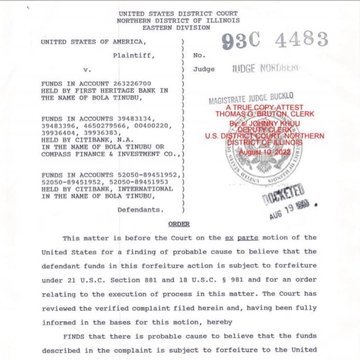 The document which contains a judgement docketed on July 26, 1993, and certified by Thomas O. Burton, clerk of the court, indicted Tinubu for heroin trafficking in the state of Illinois through a proxy organisation owned by Adegboyega Mueez Akande and subsequently forfeited the proceeds of the crime to the US government.