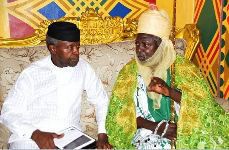 The vice president who arrived at the palace at about 4 p.m., was greeted by a large crowd who chanted Sai Baba referring to President Muhammadu Buhari and his singing his name in different songs as they escorted him to the palace.